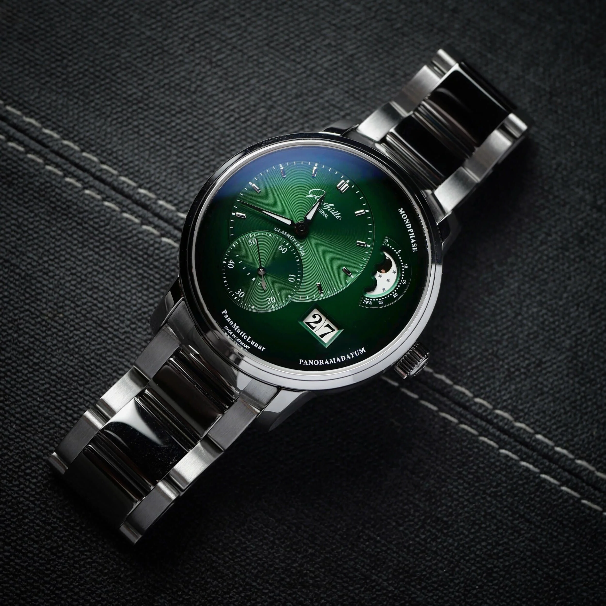 Dial: Forest green varnished green/black with a fine matt surface featuring hours and minutes, small seconds, panorama date and moon phase.