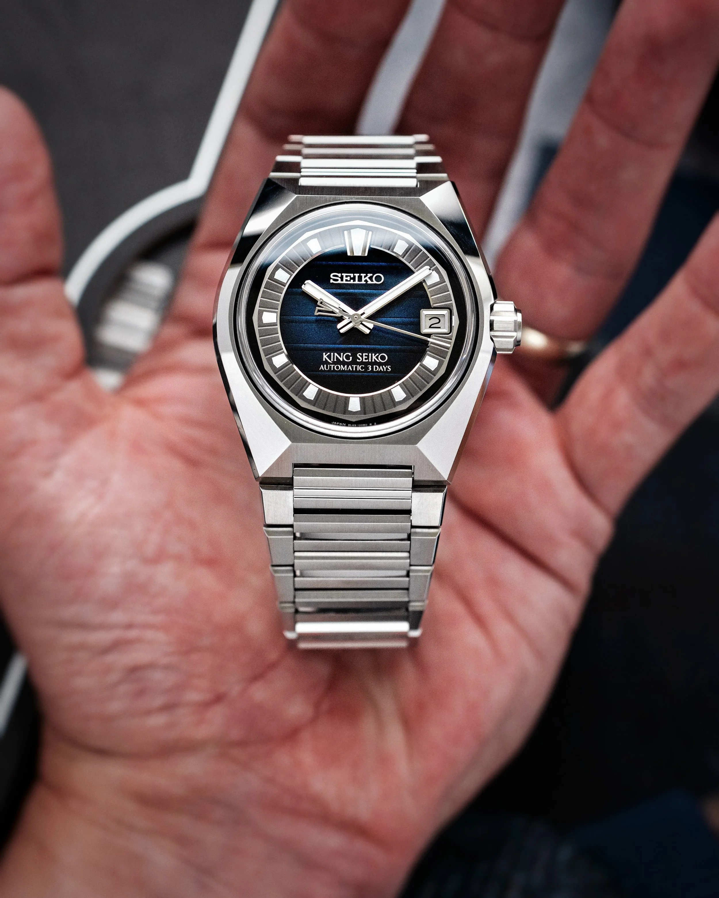 The SLA085J1 is part of the 2025 King Seiko Vanac collection, inspired by the angular, sporty designs of the 1970s. It features a striking navy blue dial, no bezel, and Seiko’s 8L45 automatic movement.